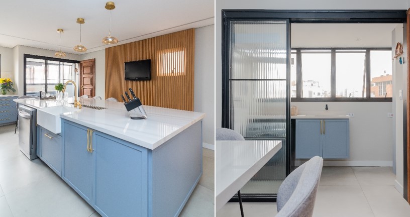 Mas isso não quer dizer que os dois ambientes precisam ter o acesso completamente aberto: seja pela interferência de odores dos pratos preparados e que podem impregnar nas roupas penduradas no varal ou mesmo pelo desejo de não deixar a área de serviço exposta para todos, a arquiteta Mari Milani conhece de perto essa missão propiciar discrição em ambientes tão próximos, mas com vida própria. “Mesmo realizando um fechamento, não excluímos a praticidade que é executar as tarefas domésticas entre os dois espaços”, explica.