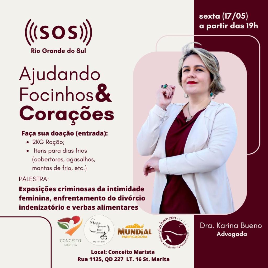 Ao falar sobre o evento, Drª. Karina Bueno transpira muita alegria: “A ideia surgiu porque passei a acompanhar notícias envolvendo as vítimas da tragédia: entre as várias situações envolvendo política, resgates e obituários, surgiu uma postagem em um dos meus grupos de Whatsapp sobre um ponto de coleta em Goiânia para levar insumos às vítimas. Nessa hora, pensei: ‘por que não doar minha mão de obra para ajudar as pessoas das duas formas: com um evento, com arrecadação de ração e itens para se agasalhar/proteger do frio?’ – Drª. Karina Bueno continua – O que eu percebo, é que as pessoas adoram fazer críticas sobre qualquer coisa, mas a verdade é, que quando queremos, encontramos formas de ajudar o próximo: não é necessário ser rico para ajudar, mas ter boa vontade e querer ajudar.”