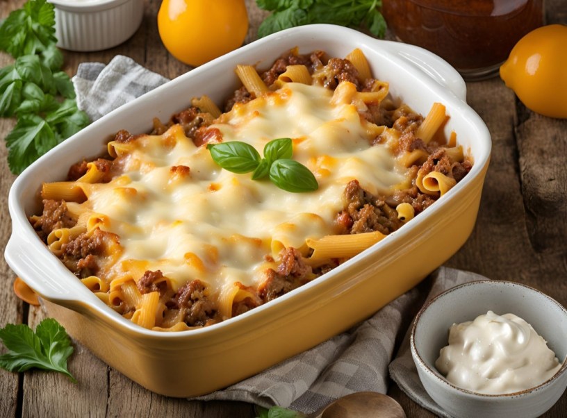 Coloque o macarrão num refratário, espalhe o queijo picado e forre com o molho de carne. Depois, finalize com o creme de leite Marajoara e leve ao forno para gratinar.